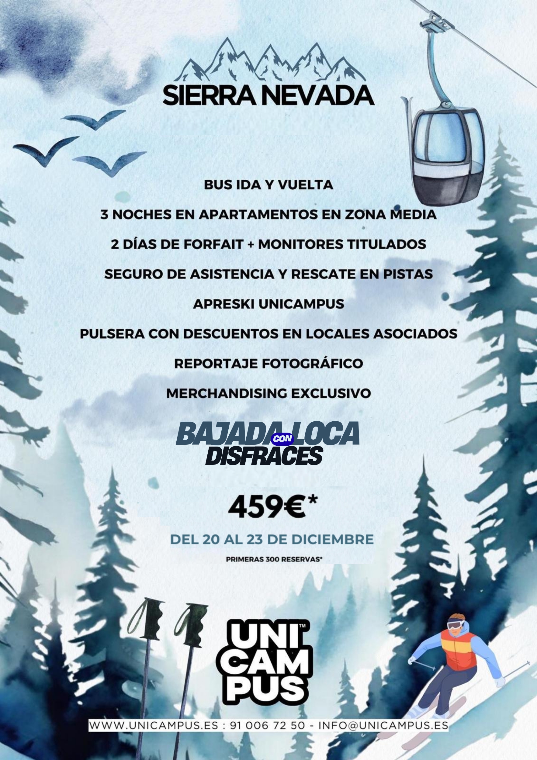 Salida en bus desde Madrid el día 20 de diciembre, llegada a los apartamentos en Sierra Nevada, días de esquí según paquete con Forfaits contratados, asistencia de nuestros monitores con actividades y fiestas exclusivas y vuelta a Madrid el 23 de diciembre.